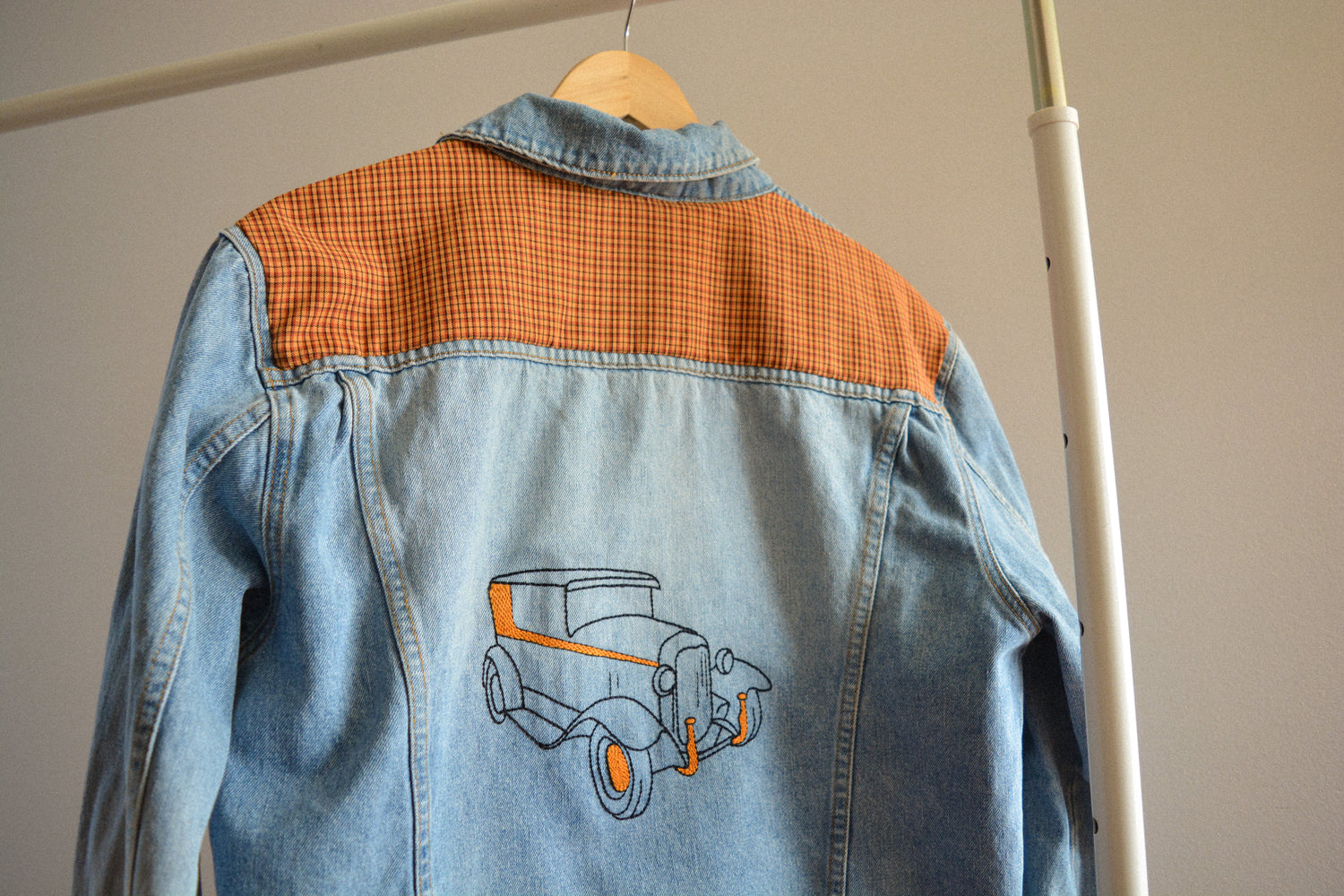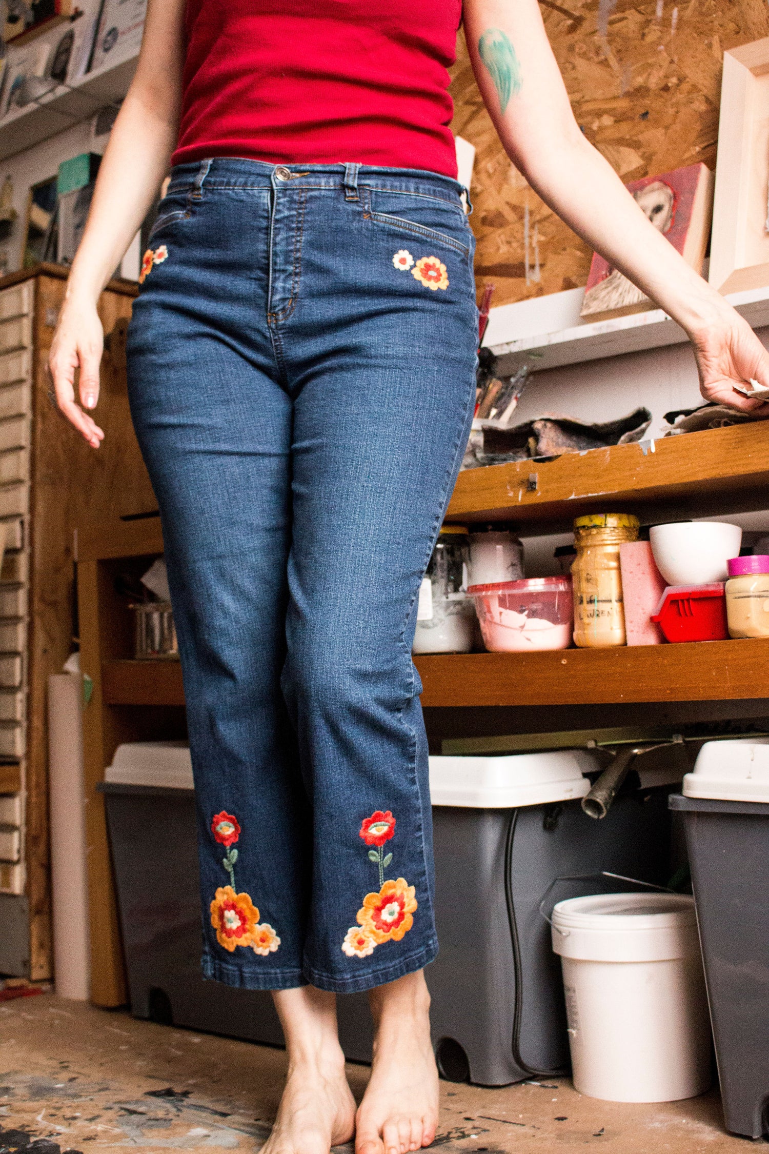 Motif fleurs colorées sur jeans bleu, broderie, 2021